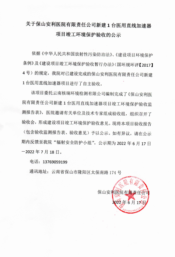 我院對使用II類射線裝置核技術(shù)利用項目進(jìn)行了現(xiàn)場檢查和驗收。委托云南核瑞環(huán)境檢測有限公司編制完成了《保山安利醫(yī)院有限責(zé)任公司新建1臺醫(yī)用直線加速器項目竣工環(huán)境保護(hù)驗收監(jiān)測報告表》,醫(yī)院邀請有關(guān)單位及技術(shù)專家組成驗收組,組織召開了驗收會,形成建設(shè)項目竣工環(huán)境保護(hù)驗收意見。現(xiàn)將本項目驗收報告(包含驗收監(jiān)測報告表、驗收意見)予以公示。如有異議,請在公示期內(nèi)反饋至我院“輻射安全防護(hù)小組”。公示期為2022年6月17日-2022年7月18日,公示時間為20個工作日。