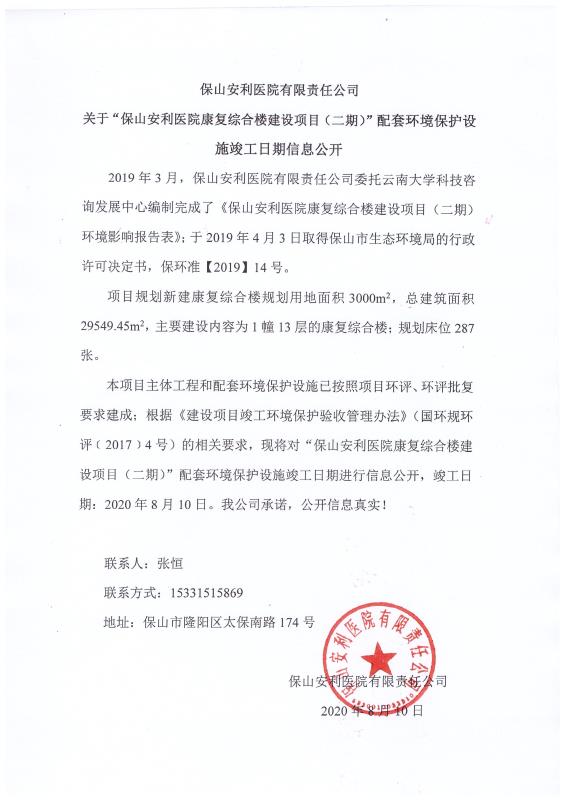 保山安利醫(yī)院有限責(zé)任公司關(guān)于“保山安利醫(yī)院康復(fù)綜合樓建設(shè)項目(二期)”配套環(huán)境保護設(shè)施竣工日期信息公開